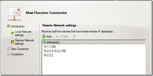 Here is another article (external site) that covers the creation of a receive connector with IP access controls.