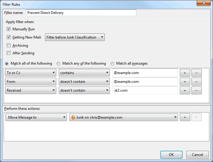 Users who are unable to implement protection against direct delivery attacks at firewall or server level, may also implement protection in email clients using filters.