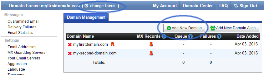 Click the Add New Domain button and enter the name of your new domain. With your new domain added, use the change focus link at the top of the page to switch back and forth between your domains. For each domain you add, you must complete all the setup steps including adding email addresses and changing the MX records for your newly added domain.