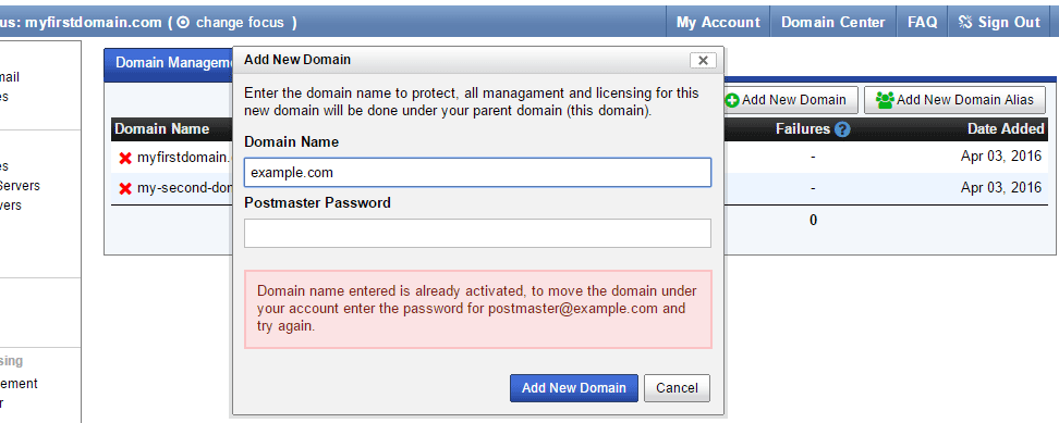 To get started login to your parent domain, visit the domain management page and select Add New Domain.If the domain is already registered with us you will be prompted to supply the password for the [email protected] address to verify you are the owner of the domain. Once verified the domain will instantly jump into your parent, now acting as a child.