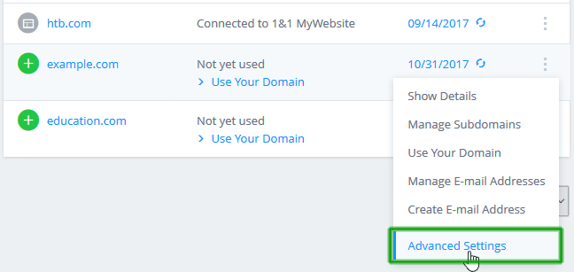 Click Advanced Settings from the dropdown menu for your domain. Depending on the version of your interface it may also be listed as Edit DNS Settings.