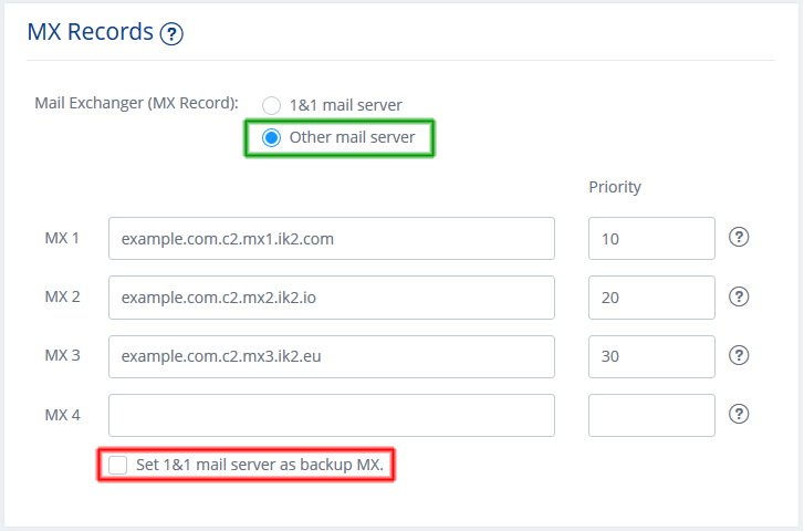 Under the MX Records section, select other mail server and enter the three MX Servers assigned to you from the table below.