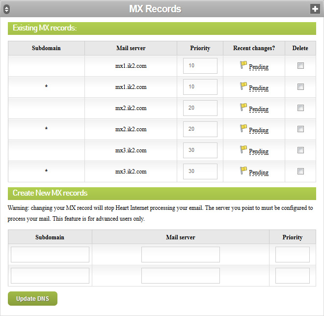Continue adding the three MX servers in the above list, when completed you will end up with a list of MX records that look like this sample: