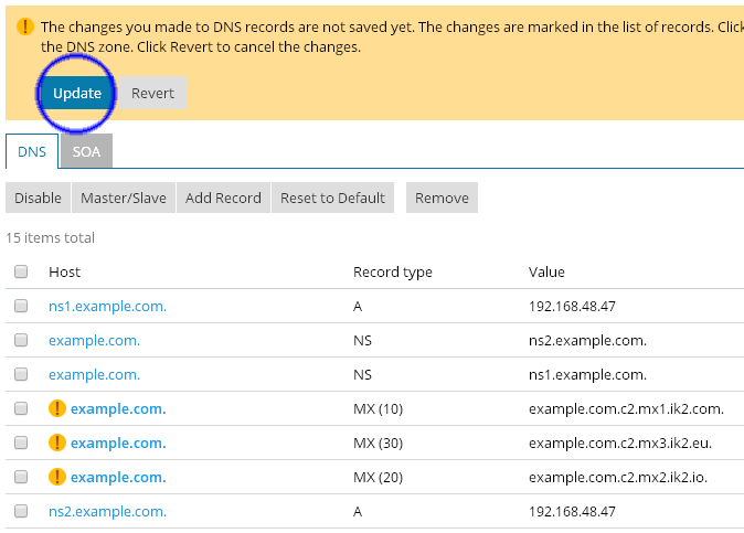 With three new MX records added to your DNS server, save your changes using the update button at the top of the page.