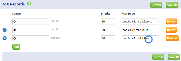 Delete the existing MX records, by clicking the delete button. You will be adding new MX records which will point your email to our network of servers.
