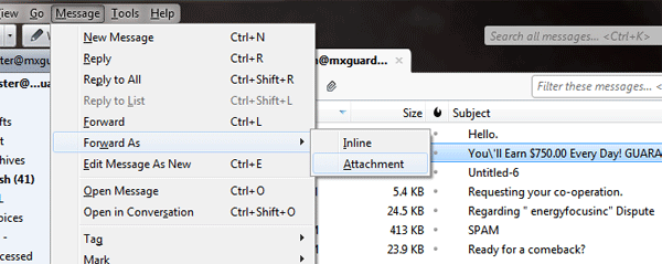 3) You should now have a new message ready to be forwarded with your spam attached. You can drag additional messages from your inbox to the attachment area to send multiple messages at once.
